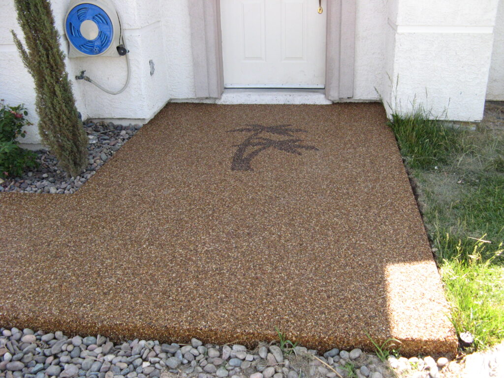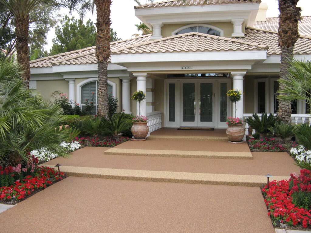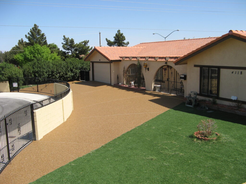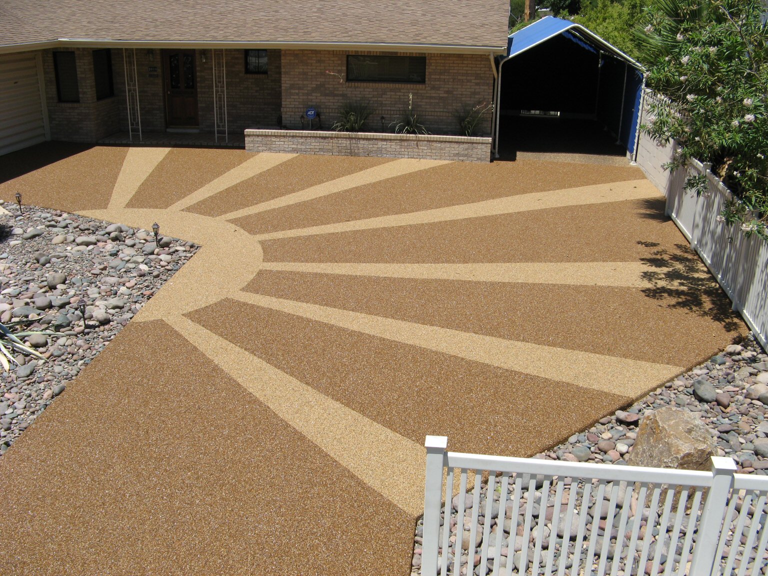 The driveway at this house occupied so much of the front area and had many angles. Utilizing the colors of the stack stone wall, the Coralite and Apache colors in a radiating sun patterned allow a unique focus to this driveway while showcasing the house stack stone.
