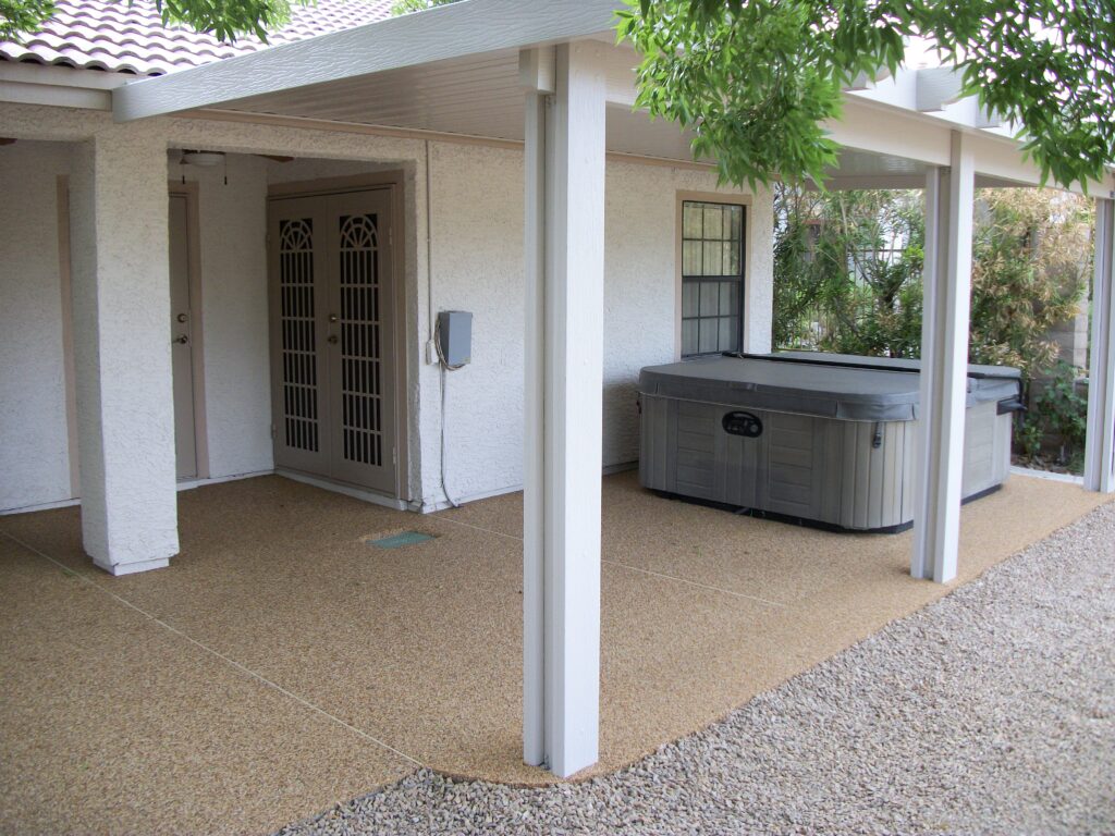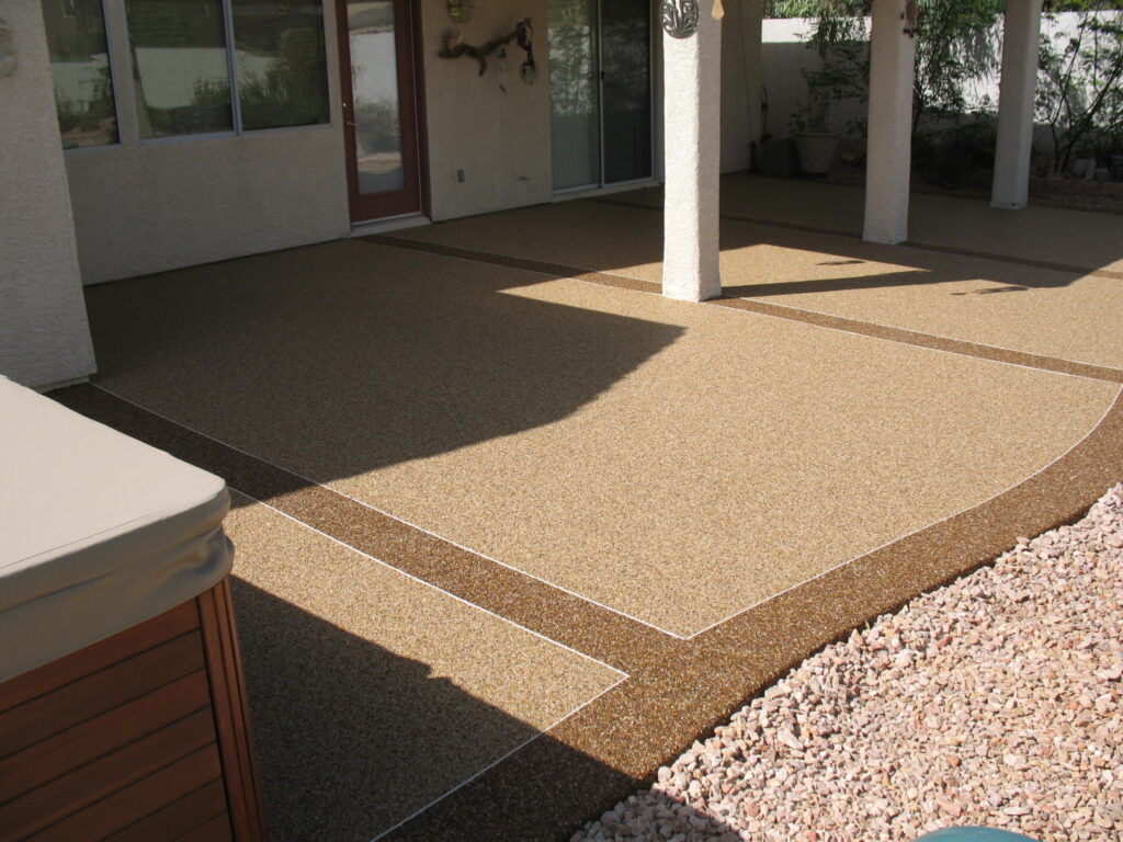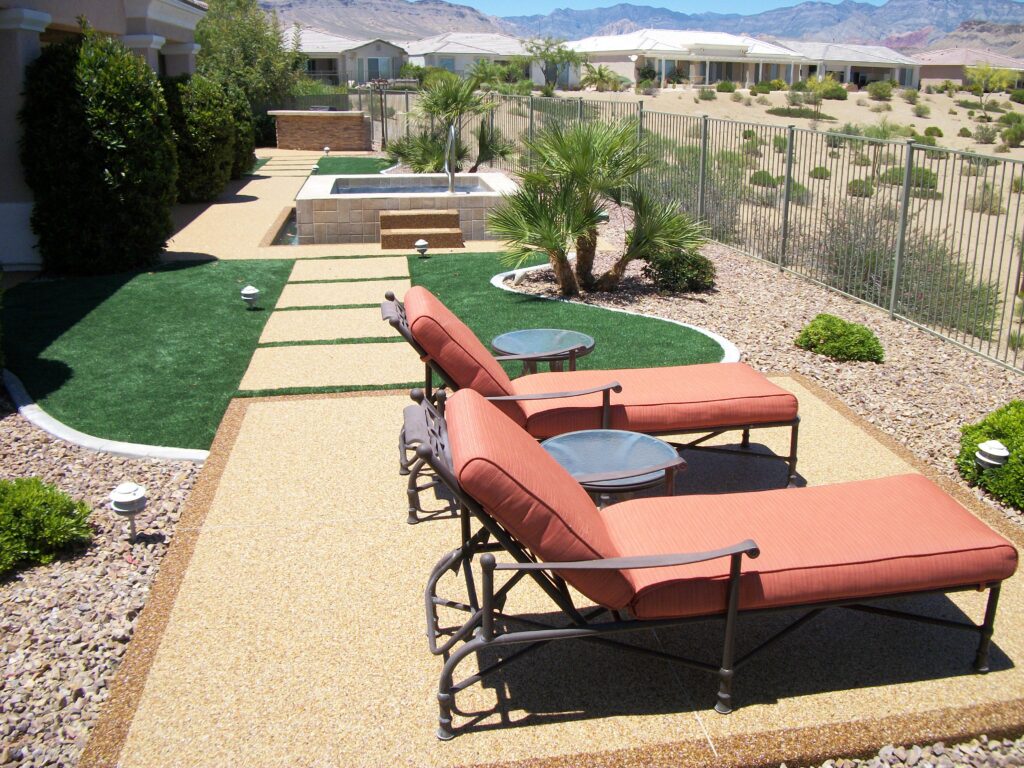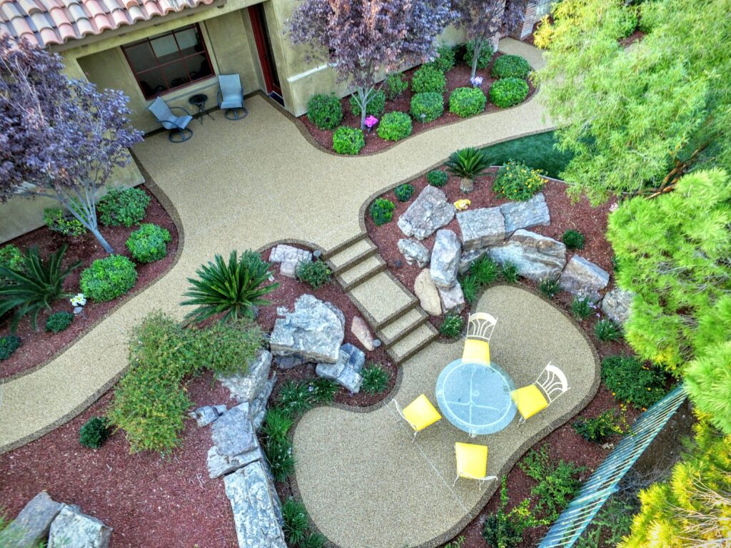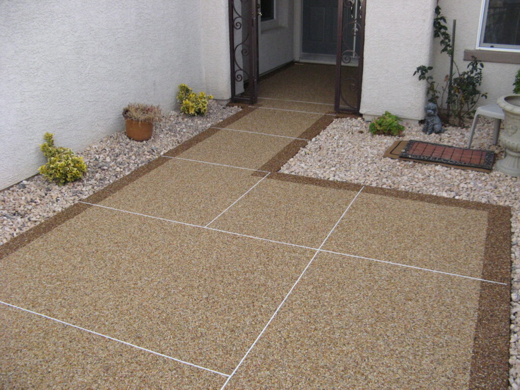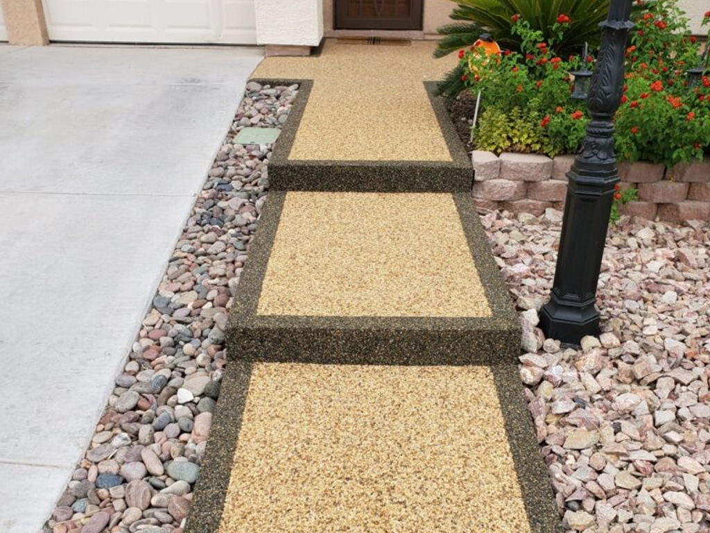 This house had many separate sections of concrete pours. In order to highlight the walkways, we chose Caramel Blend as it matched the color of the landscaping rock outside their fence and highlighted the open space