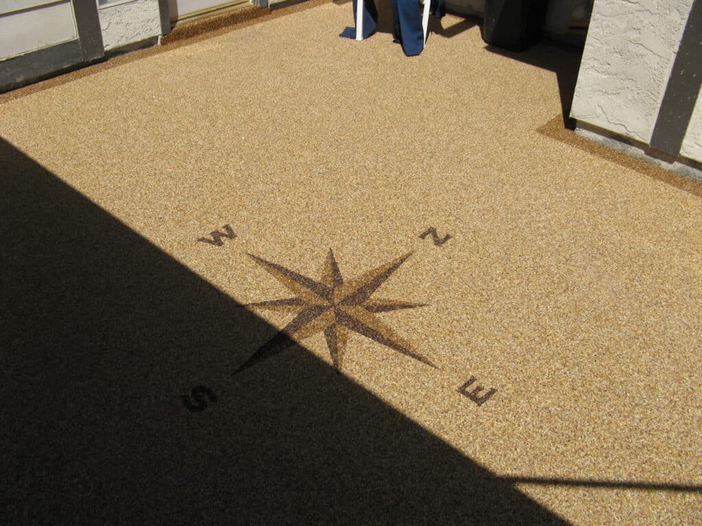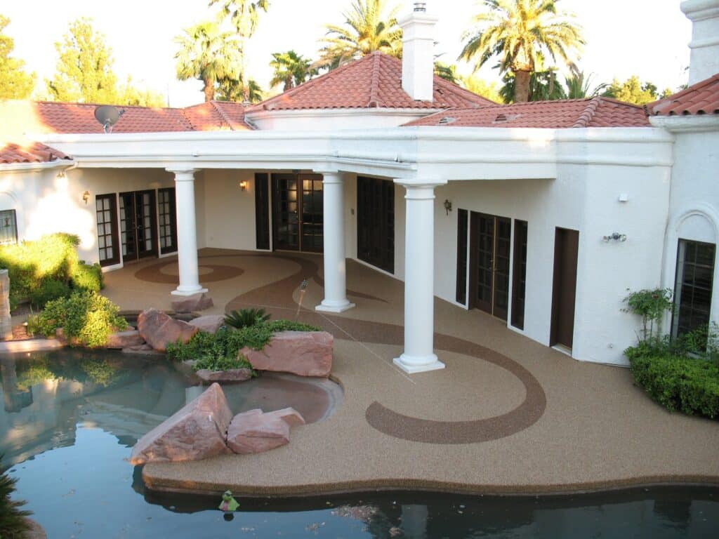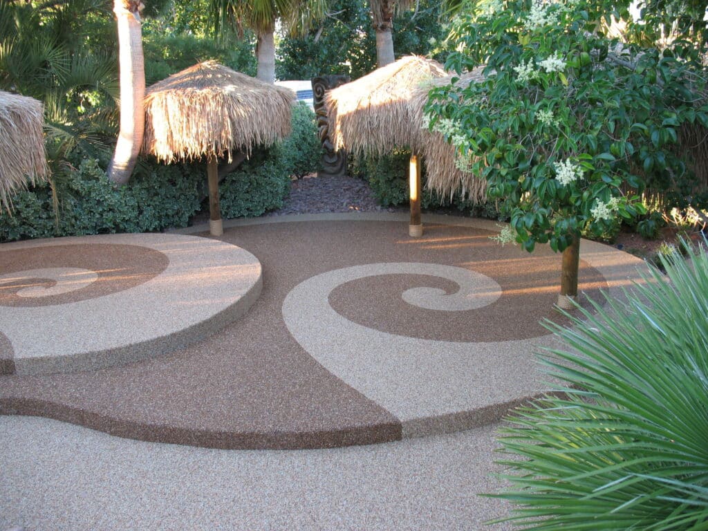Having irregular shape concrete areas create challenges in design. However using the open space with a design element in the middle allowed for a flow of space, choosing Coralite and Apache colors highlighted the pebble tec pool plaster colors.